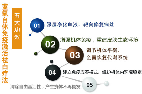 直接作用于脏腑及血 液之内,通过刺激机体内的非特异性免疫反应,达到患者自身血液与免疫活性氧有序平衡净化;提高血氧饱和度,改善血液循环,激活细胞代谢,提高人体的组织活 性,从而组织的供氧状况得到改善。多种功效有机结合,靶向治疗,深度修复病灶,促进黑色素细胞再生药物中细胞营养修复因子,刺激黑色素细胞合成细胞生长因 子。